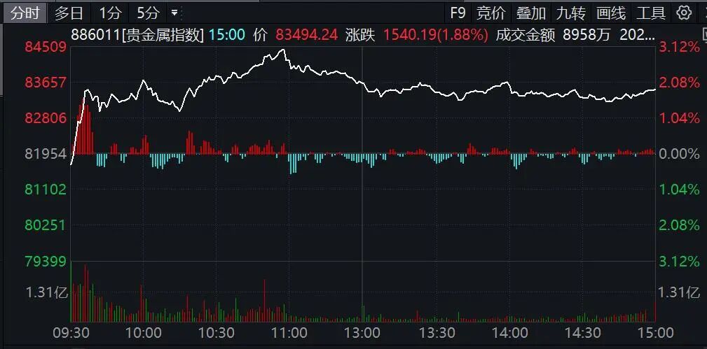 市场热点方面,资源股全线走强,其中黄金板块指数大涨逾2%,板块内所有个股上涨无一下跌,赤峰黄金、中金黄金、湖南黄金等涨幅居前。
