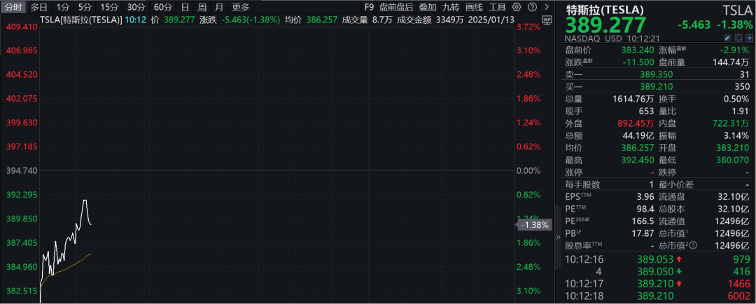 特斯拉盘中一度跌超3%,最新跌幅为1.38%。