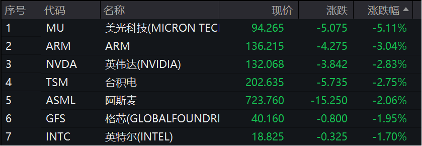 多只芯片股大跌,英伟达盘中一度跌超4%,最新跌幅为2.83%。台积电一度跌近4%,最新跌2.75%。美光科技跌超5%。