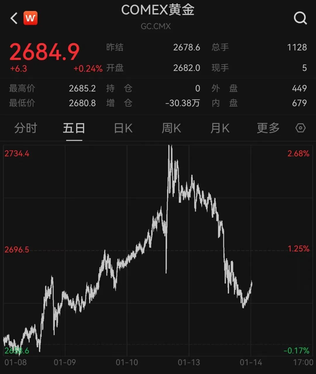 1月14日早上开盘,COMEX黄金期货有所企稳,最新报2684.9美元/盎司。