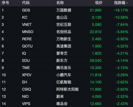 金山云跌超10%,名创优品跌近6%,新东方跌超4%,爱奇艺、小鹏汽车跌超3%,蔚来、理想汽车跌超2%。
