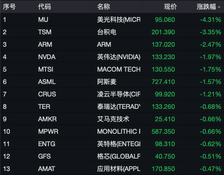 美国发布人工智能出口管制措施,芯片股走低。美光科技、超微电脑跌超4%,台积电跌超3%,英伟达跌近2%。