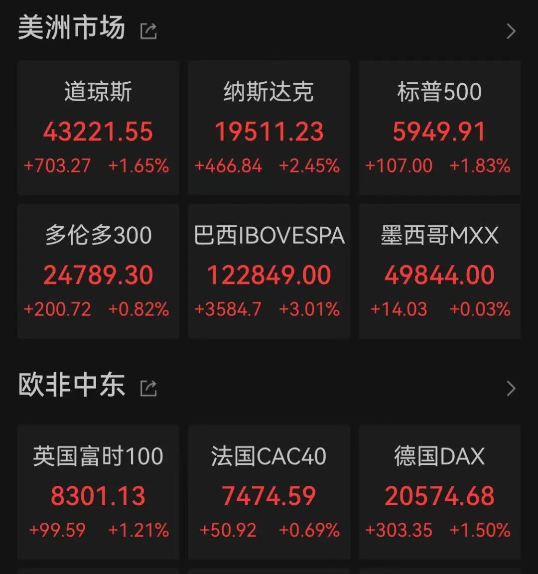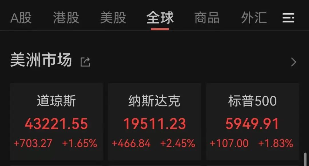 由于美国通胀放缓提振降息预期,美股市场集体大涨,道指涨1.65%,标普500指数涨1.83%,纳指涨2.45%。