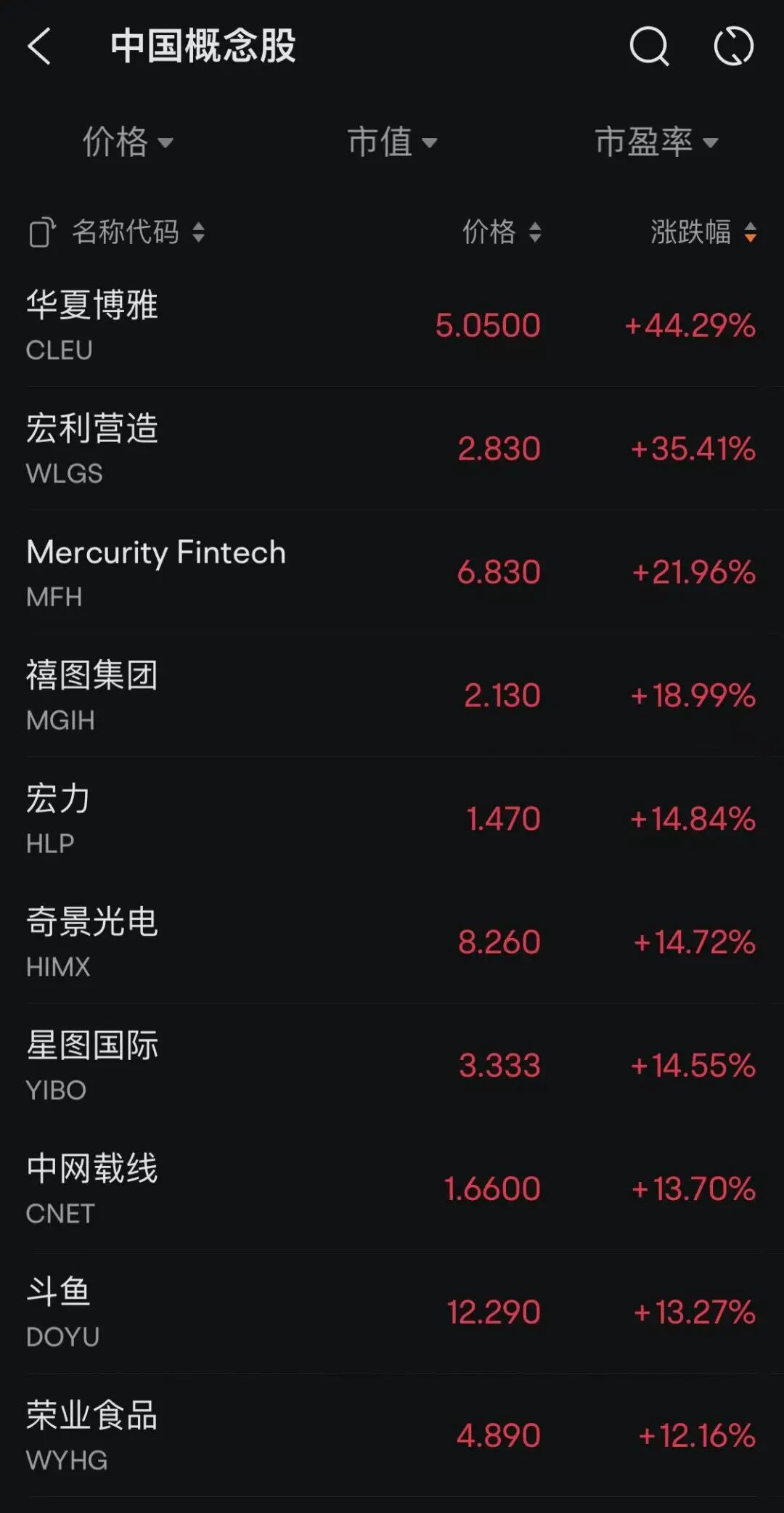 中概股方面,受欧美市场集体大涨的提振,纳斯达克中国金龙指数涨近1%,热门中概股中有多只股票涨超10%,其中,斗鱼涨超13%,星图国际涨超14%,网易涨超8%。