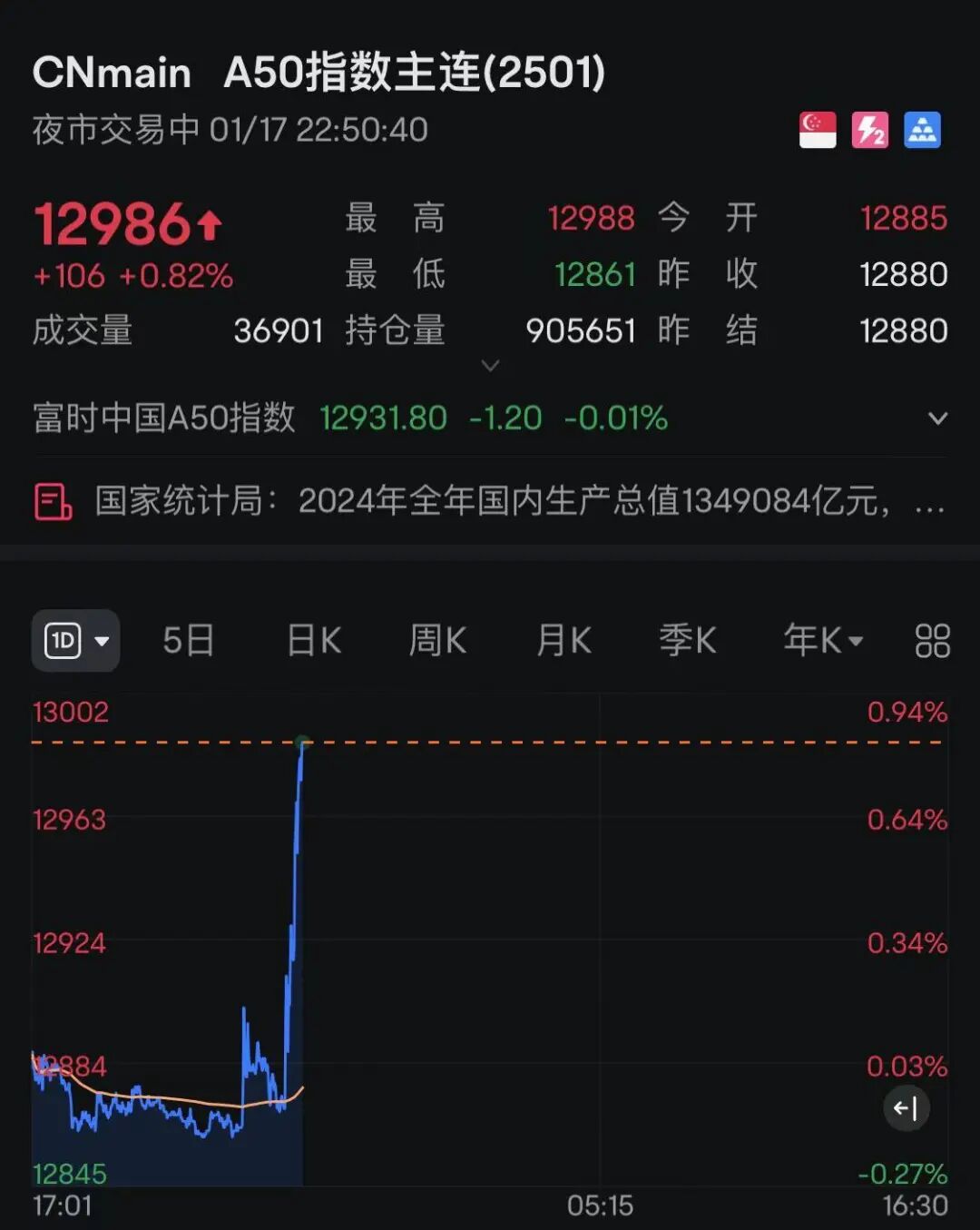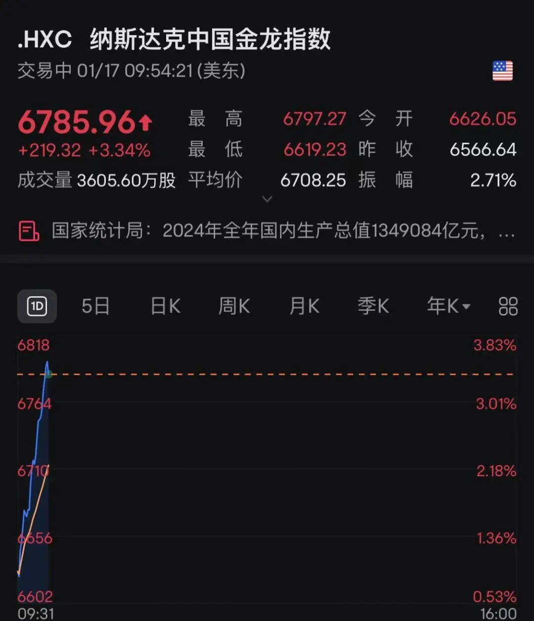 中概股方面,纳斯达克中国金龙指数也大幅拉升,截至发稿涨超3%,此外,富时中国A50指数期货直线拉升。
