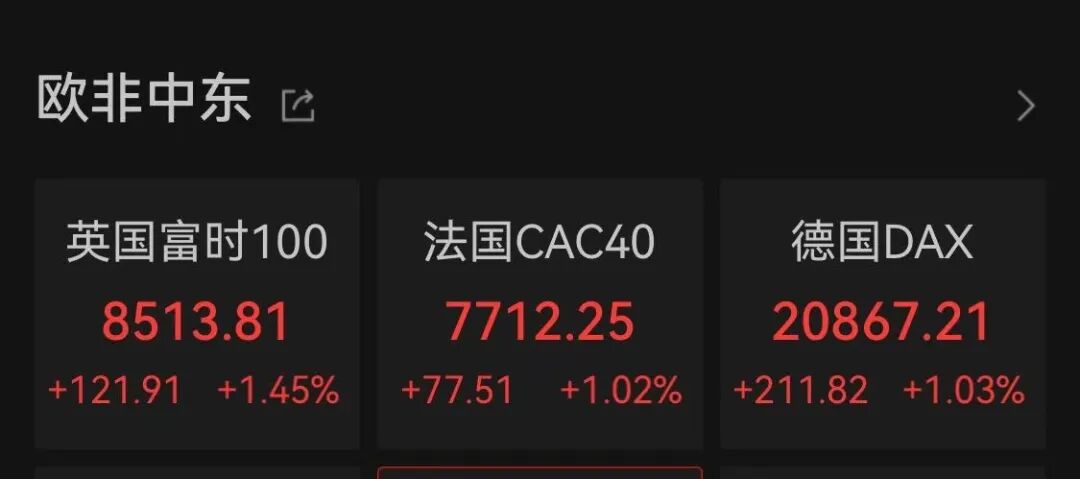 晚间,英、法、德三国指数纷纷大涨,其中英国富时100指数涨幅超过1.4%。
