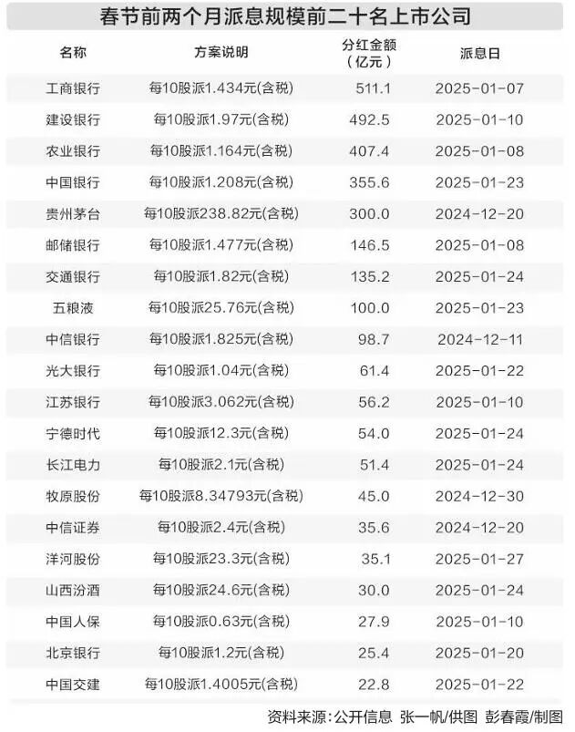 截至1月23日,已有318家上市公司宣布,计划在2024年12月、2025年1月落地分红,分红总金额超过3400亿元。春节前最后一周(1月20日至27日期间),是农历年前分红的最高峰,将有88家公司超过1千亿元的大红包,送到股民的手中。