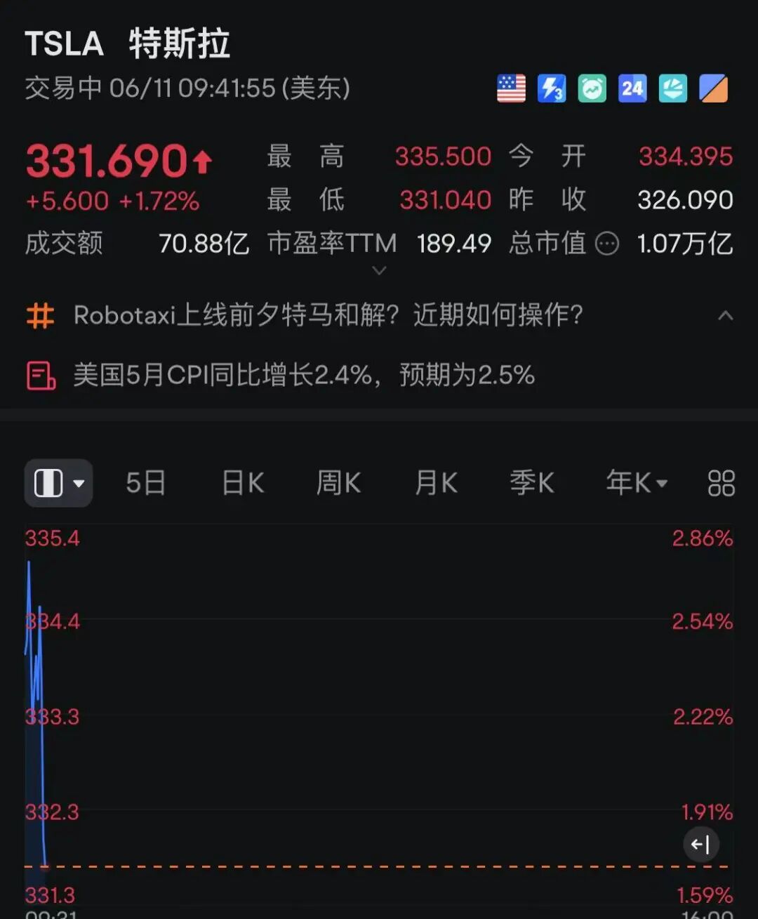 个股方面,特斯拉开盘涨超1%,马斯克最新表示,首辆实现全自动驾驶的特斯拉汽车将于6月28日从工厂生产线直接开到客户家中。Robotaxi公开试运营预计将于6月22日开始。