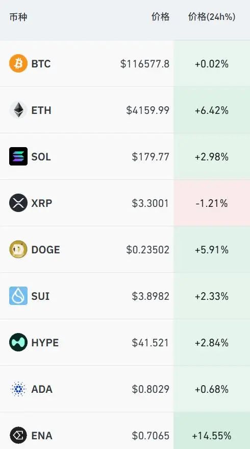 截至发稿,比特币报116577.8美元;以太坊大涨逾6%,报4159.99美元。Coingecko最新数据显示,随着以太坊价格短时突破4200美元推动其市值重返5000亿美元上方(触及5025亿美元),加密货币总市值也再次突破4万亿美元。