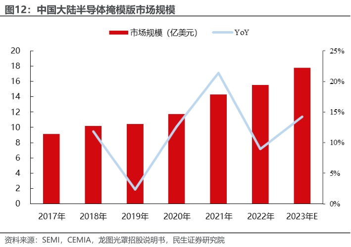 根据SEMI、CEMIA数据,全球半导体掩模版市场规模有望在2025年达到60.79亿美元,同比增长7%。中国大陆半导体掩模版市场规模快速增长,从2017年的9.12亿美元增至2022年的15.56亿美元,2017-2022年复合增速达到11.3%。