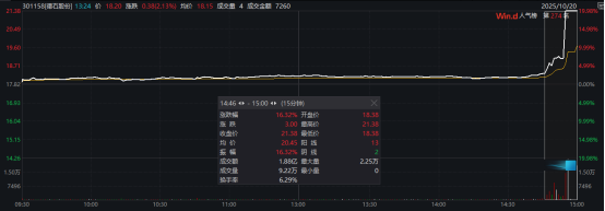 今日尾盘,德石股份直线拉升,最终20%涨停。行情资料显示,德石股份最后15分钟成交1.88亿元,占全天成交的79%,多次1分钟成交超过前一交易日全天成交。