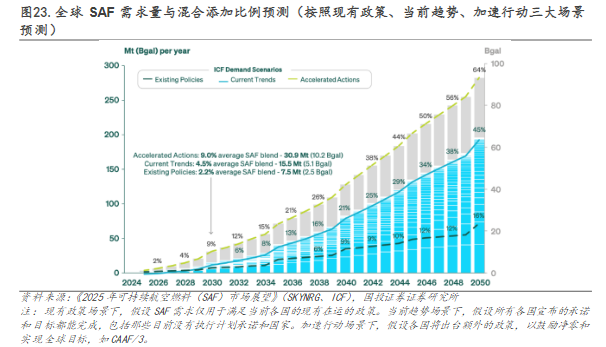 根据《2025年可持续航空燃料(SAF)市场展望》的预测,在当前趋势的中性场景下(假设目前各国宣布的承诺和目标都能完成),到2030年,全球SAF需求预计达1550万吨,到2050年,全球SAF需求将增长至1.96亿吨。2025年是RFEUA强制添加SAF实施的第一年,SAF价格自2025年下半年开始持续上涨,随着航空业添加比例进一提升,SAF需求空间广阔。