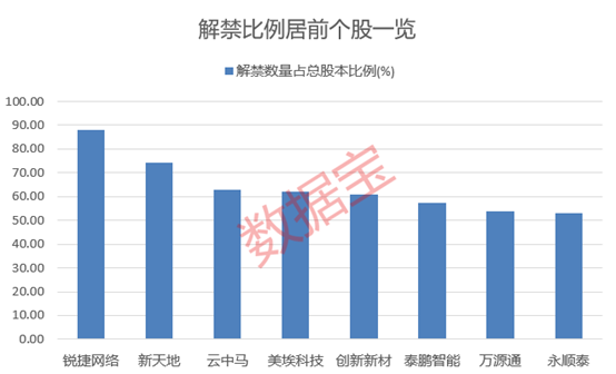从解禁比例来看,锐捷网络、新天地、云中马、美埃科技等8股的解禁比例均超50%,锐捷网络的解禁比例最高,为88%。