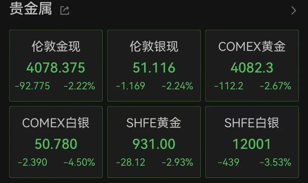 除美股之外,黄金与白银也处于下跌通道之中,COMEX黄金跌逾2%,COMEX白银暴跌超4%。
