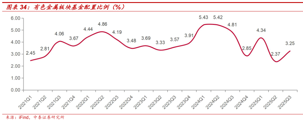 25Q3有色金属板块基金配置比例为3.25%,环比增配0.88pct,不及标配0.23pct。
