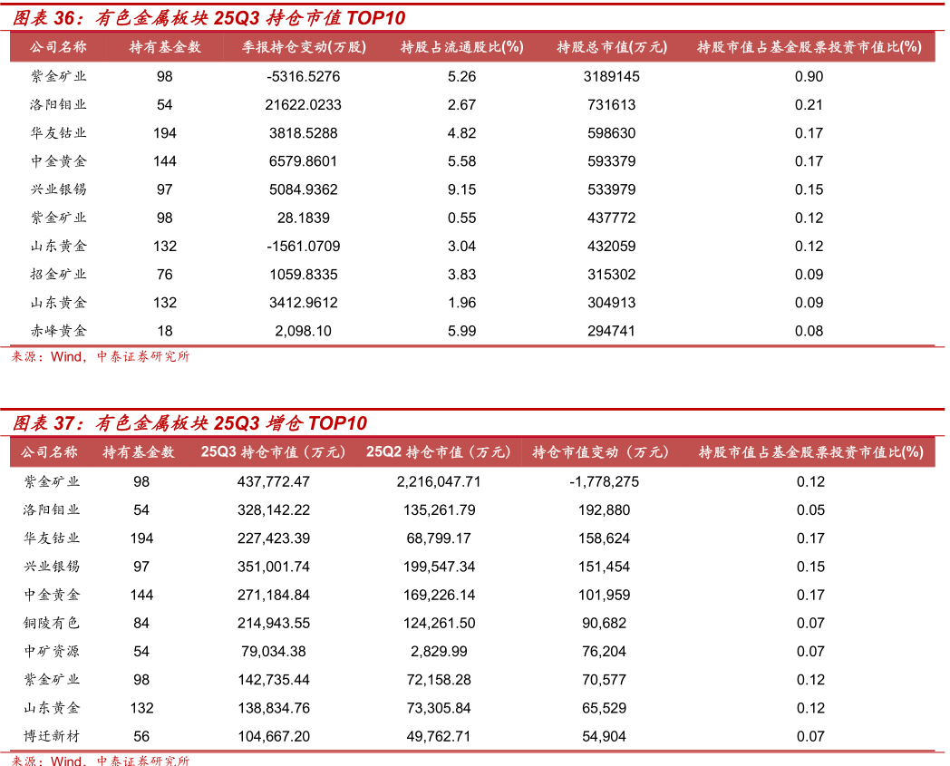 增仓TOP10分别为紫金矿业、洛阳钼业、华友钴业、兴业银锡、中金黄金、铜陵有色、中矿资源、紫金矿业(港股)、山东黄金、博迁新材。