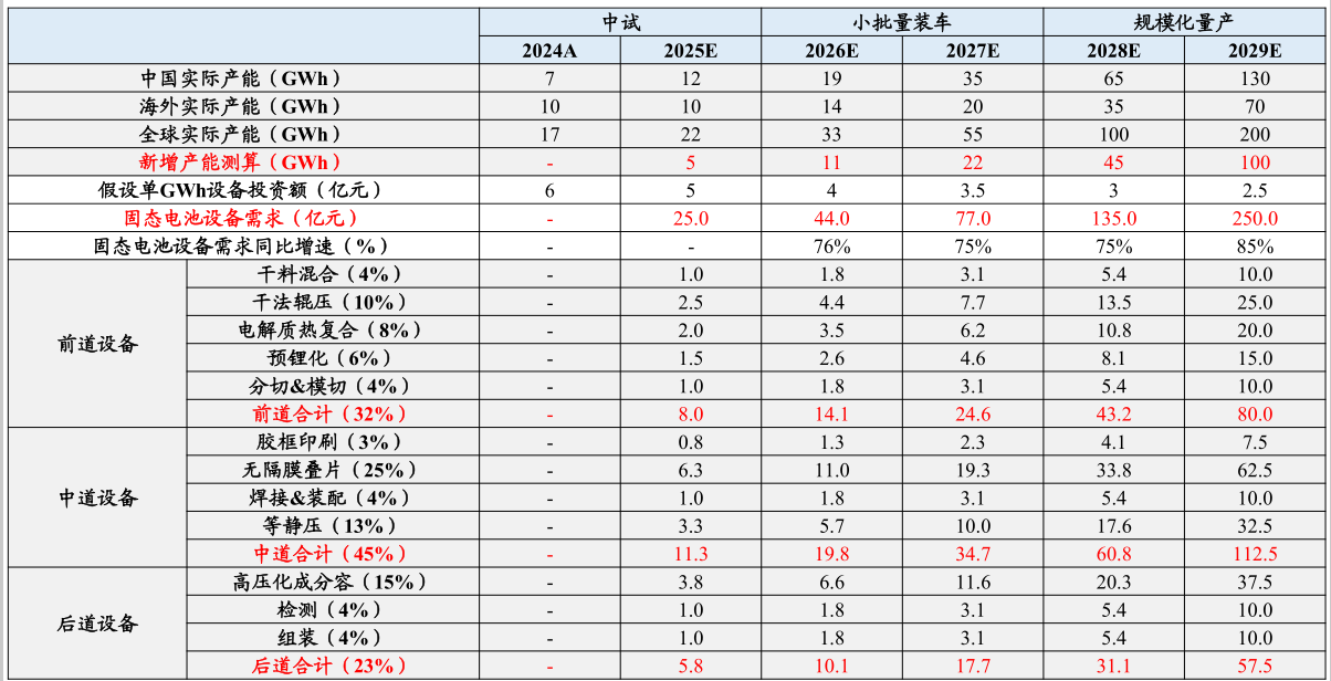 预计固态电池前道设备2029年市场空间有望达80亿元。