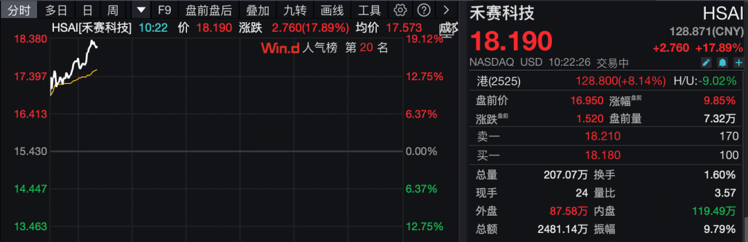 禾赛科技涨近18%。11月24日,禾赛科技在上海禾赛麦克斯韦全球研发智造中心举办2025技术开放日活动。活动中,禾赛科技发布基于RISC-V架构的激光雷达专用高性能智能主控芯片费米C500。