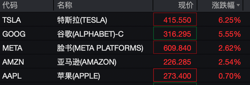 美股大型科技股普遍上涨。截至发稿,谷歌涨逾5%,再创历史新高;特斯拉涨超6%。