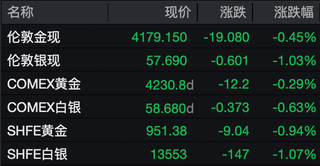 贵金属也出现跳水。截至发稿,现货黄金、现货白银跌幅分别为0.45%、1.03%。
