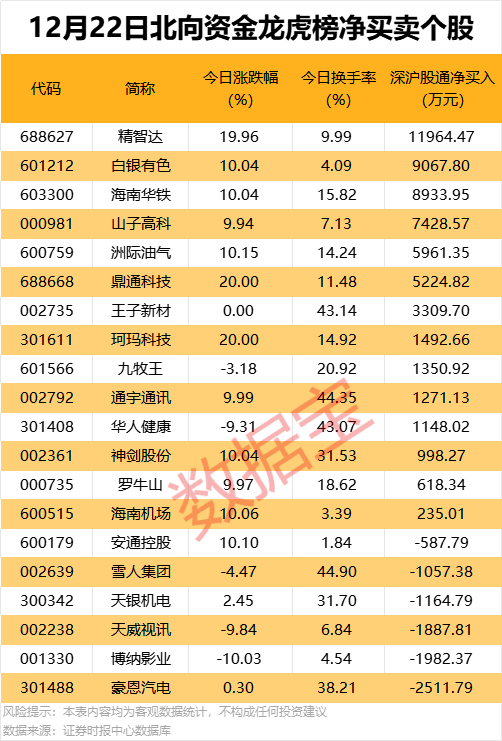今日龙虎榜现身个股中,14股获北向资金净买入,其中精智达获北向资金净买入超1亿元,居首;白银有色、海南华铁获北向资金净买入均超8000万元。