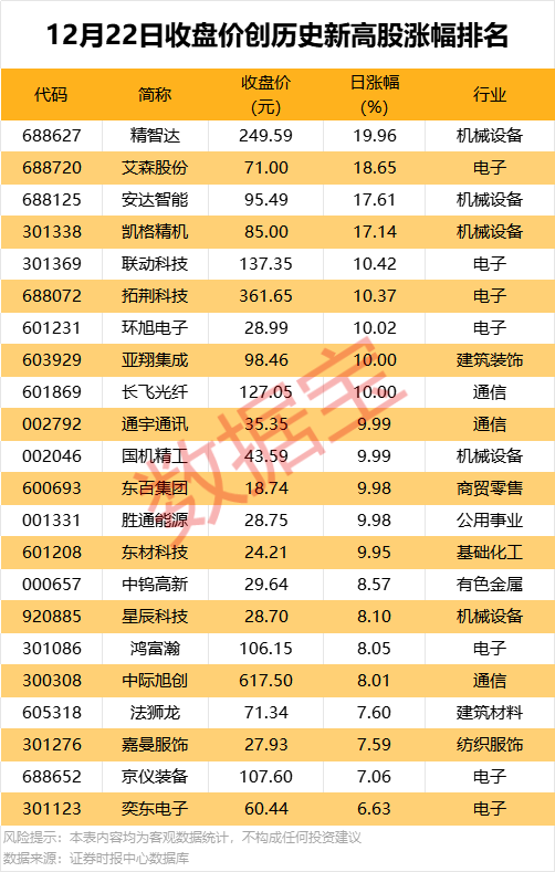 从股价表现看,收盘价创历史新高股中,今日股价平均上涨6.89%,涨停的有环旭电子、亚翔集成、长飞光纤等,涨幅居前的有精智达、艾森股份、安达智能等。