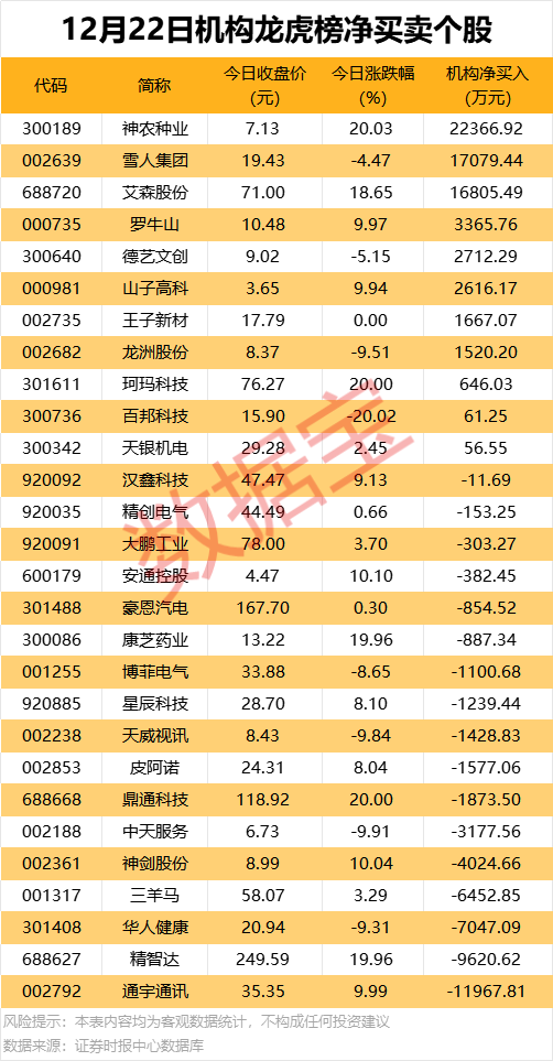 今日龙虎榜中,净买入个股有11只,净卖出的个股为17只。3股净买入金额均超1亿元,神农种业获机构净买入2.24亿元,居首;其次是雪人集团、艾森股份,机构净买入金额分别为1.71亿元、1.68亿元。