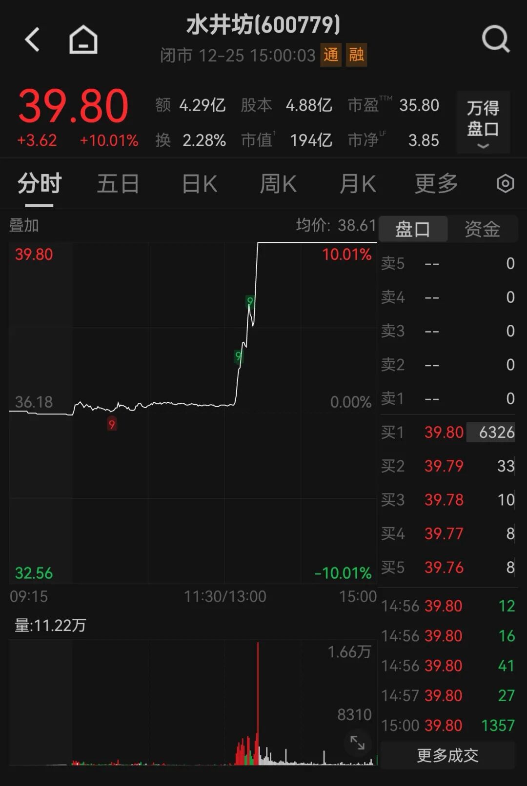 当天午后,白酒股异动,水井坊股价直线拉升封涨停,收报39.8元,总市值为194亿元。