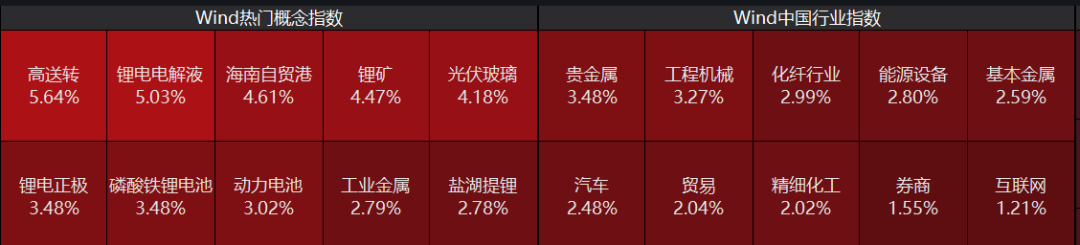 来直观地感受一下今天早上A股盘面的情况。在涨幅居前的指数当中,锂电电解液、锂矿、锂电正极、磷酸铁锂、动力电池等集体爆发。个股更是大面积涨停或涨幅超过10%。