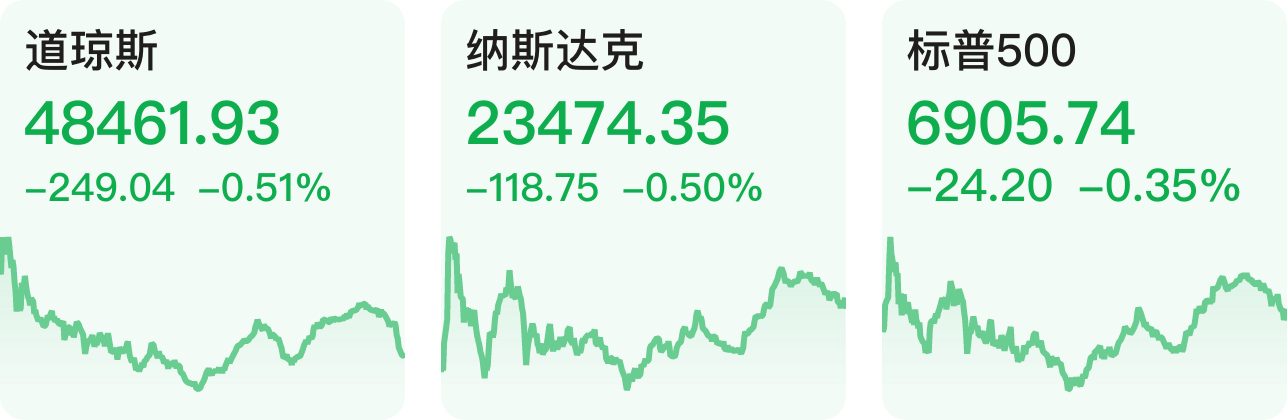 美股三大指数全部下跌。截至收盘,道琼斯指数跌0.51%,纳斯达克指数跌0.5%,标普500指数跌0.35%。大型科技股多数下跌,特斯拉跌超3%,英伟达跌超1%;美光科技涨超3%创新高,英特尔涨超1%,苹果小幅上涨。热门中概股多数下跌,纳斯达克中国金龙指数收跌0.67%。蔚来涨超4%,爱奇艺、百度涨超1%;阿里巴巴跌超2%,名创优品跌近2%。