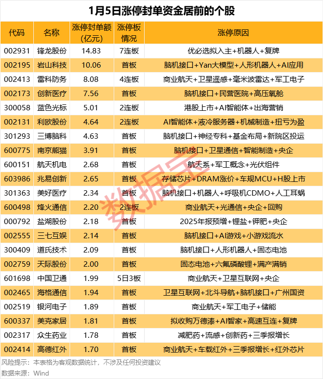 以封单金额计算,锋龙股份、岩山科技、雷科防务等涨停板封单资金较多,分别有14.83亿元、10.06亿元、8.08亿元。从封单力度(收盘封单金额占流通市值比例)来看,锋龙股份、创新医疗、光华股份等力度较大,分别为21.13%、7.68%、5.74%。