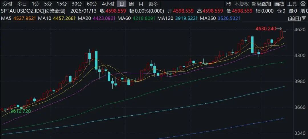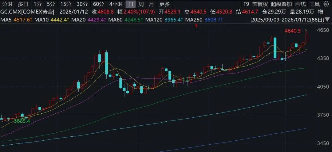 美联储调查风波引爆金属市场,1月12日国际金银大涨齐创新高,现货黄金升破每盎司4600美元;现货白银一度上涨8%。