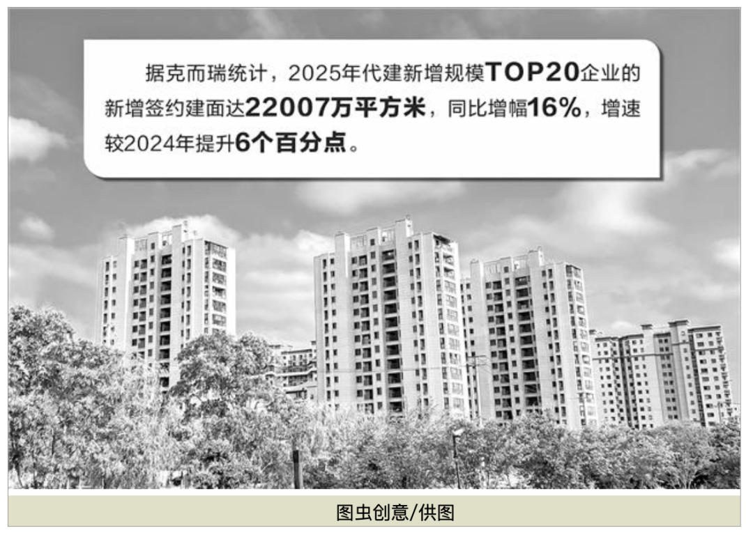 2025年,代建新拓规模逆转了2024年拓展“失速”的态势。据克而瑞统计,2025年代建新增规模TOP20企业的新增签约建面达22007万平方米,同比增幅16%,增速较2024年提升6个百分点。
