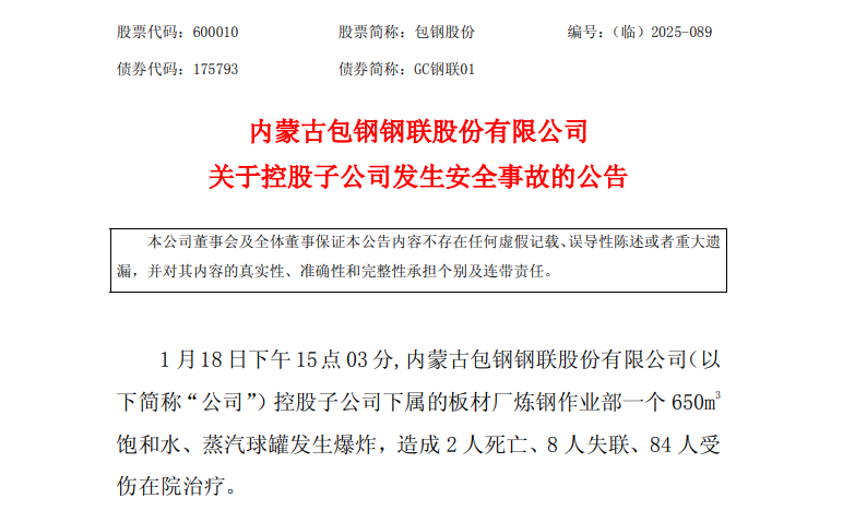 包钢股份(600010)1月19日公告,1月18日下午15点03分,内蒙古包钢钢联股份有限公司(以下简称“公司”)控股子公司下属的板材厂炼钢作业部一个650m3 饱和水、蒸汽球罐发生爆炸,造成2人死亡、8人失联、84人受伤在院治疗。