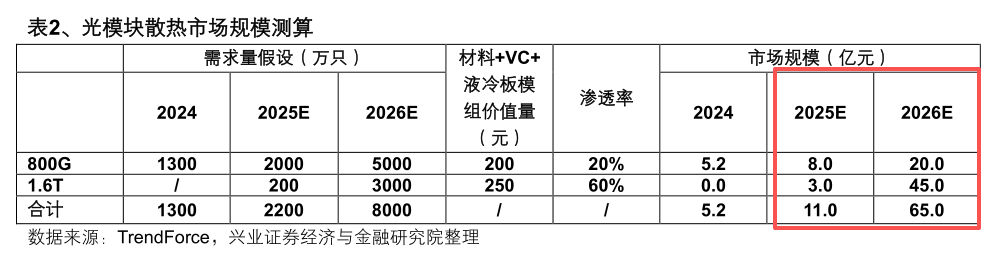 光模块散热解决方案的增量主要为VC与液冷板,假设800G/1.6T光模块对应VC+液冷板模组价值量分别为200/250元,结合对应需求量假设可以测算得到2026年整体市场规模为65亿元。