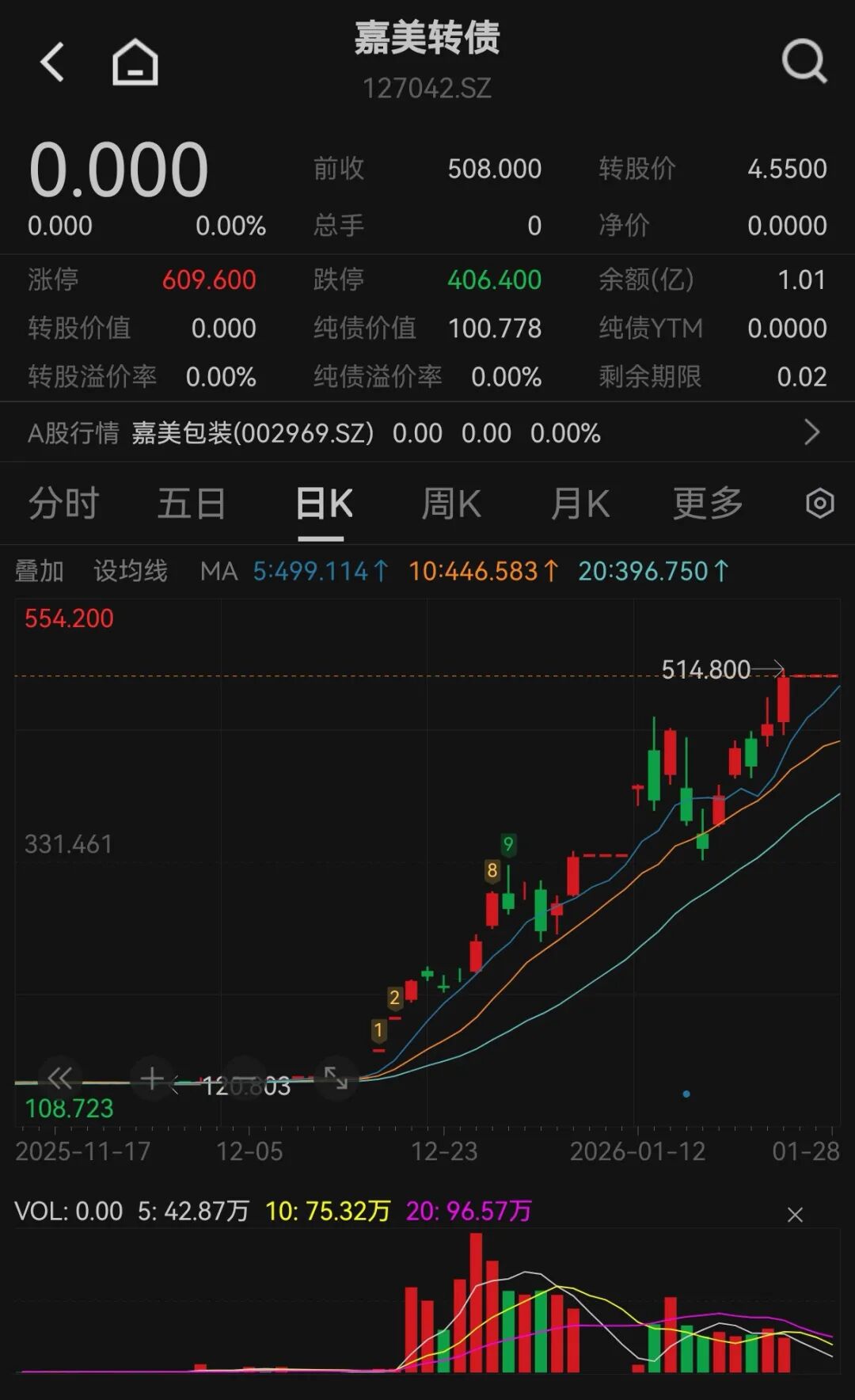 嘉美转债停牌前最后一个交易日为1月23日,转债价格为508.000元。如果投资者没有及时转股,强制赎回价格为100.893元/张,将面临巨额损失。