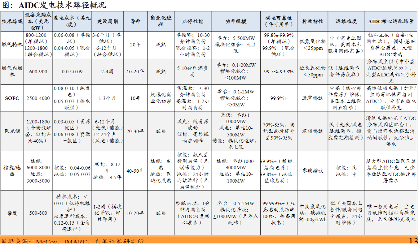 东吴证券指出,北美缺电投资逐渐从燃气轮机向燃气内燃机、SOFC扩散,当前北美缺电量仍大于各种技术总产能供应,因此该板块尚未到达选择技术路径的阶段,各类技术路径的相关投资机会都应重视。综合考虑成本、建设周期、环保等因素,燃气轮机是当前AIDC自建电最优解,燃气内燃机、SOFC、柴发为有效补充。