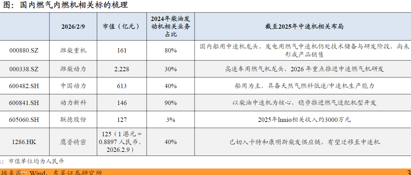 国内企业暂无直接供应美国的主机厂,但可以关注柴油发动机相关主机厂,通过产品改制验证后有望切入中速机市场,如潍柴重机、潍柴动力、中国动力、动力新科;零部件方面,关注联德股份(Innio供应商)、鹰普精密(卡特彼勒与康明斯柴发供应商)。