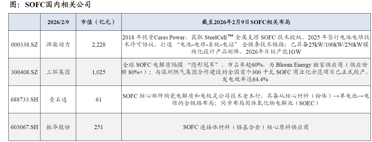 SOFC市场由BloomEnergy垄断,BE预计26年产能达2GW。国内相关公司如潍柴动力,对标BE,26年规划产能1GW。三环集团电解质隔膜全球垄断,绑定BloomEnergy。