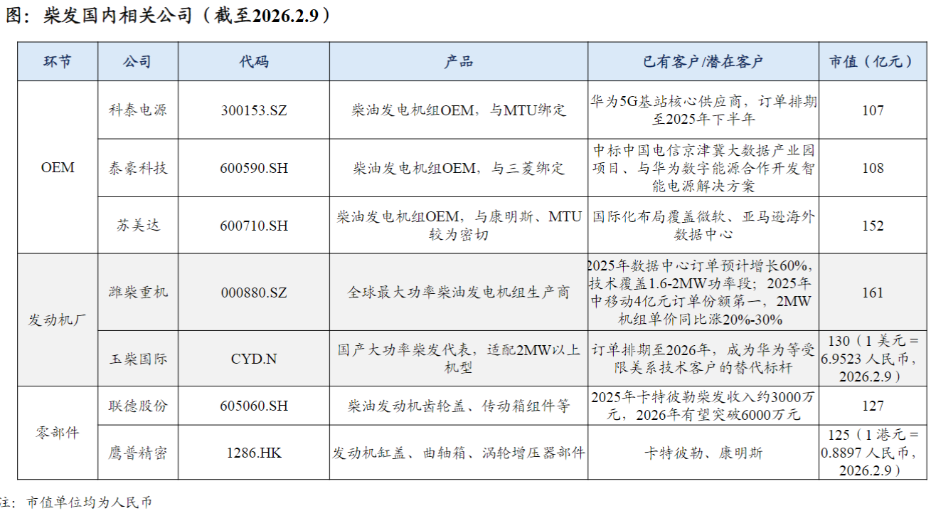 映射到A股的投资机会分为两个思路,一是从北美映射角度出发,选择国内柴发相关标的,如OEM商科泰电源、泰豪科技、苏美达,以及发动机厂潍柴重机、玉柴国际;二是选择卡特/康明斯的供应链,如联德股份、鹰普精密。