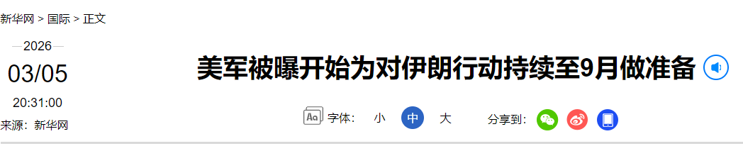 此外,美国《政治报》5日报道称,美国并未为对伊朗军事行动扩大化做好“充足准备”,目前正追加人力等资源以支持战争持续“至少100天甚至到9月”。