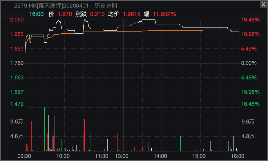 二级市场给予积极反馈,4月1日,雍禾医疗股价大涨11.93%,收盘价达1.97港元/股,成交额328.63万港元,用市场表现印证了投资者对公司发展前景的认可。