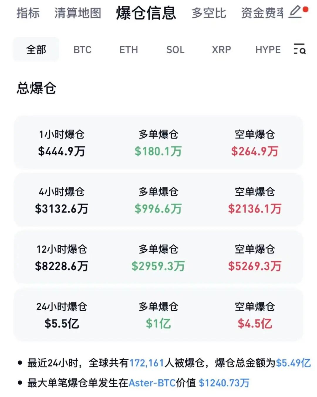 CoinGlass数据显示,过去24小时内,加密货币市场共有超过17万人爆仓,爆仓总金额超5亿美元。