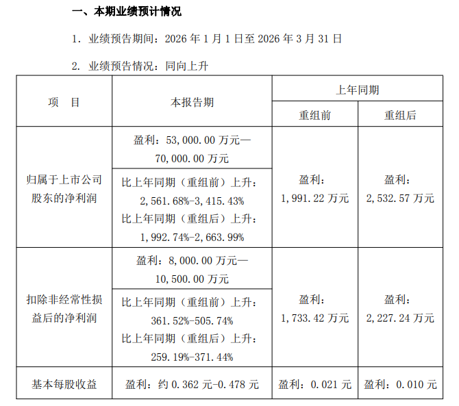 4月14日晚,佛塑科技(000973)出炉业绩预告,预计公司2026年第一季度净利润为5.3亿元—7亿元,比上年同期(重组后)上升1992.74%—2663.99%。