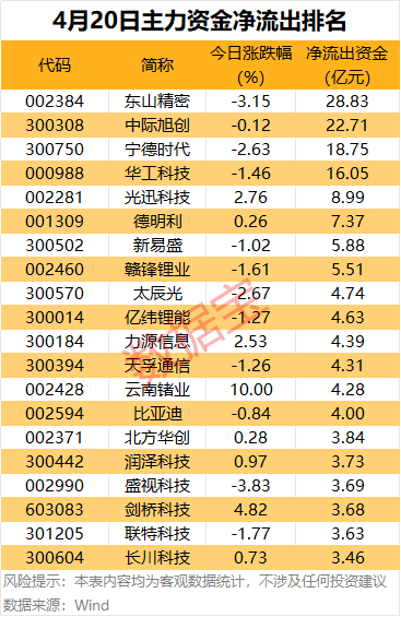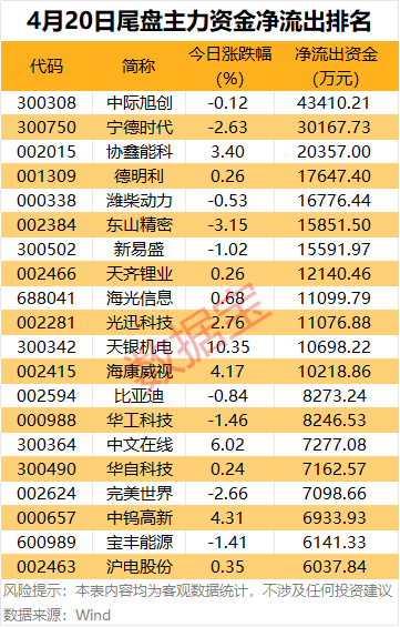 尾盘主力资金净流出方面,中际旭创、宁德时代、协鑫能科尾盘主力资金净流出均超2亿元,德明利、潍柴动力、东山精密、新易盛等个股主力资金净流出金额均超1亿元。