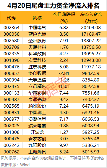 个股方面,中恒电气尾盘主力资金净流入金额超2亿元,蓝色光标、圣阳股份、天赐材料、科华数据、宏景科技、胜宏科技尾盘主力资金净流入金额均超1亿元。