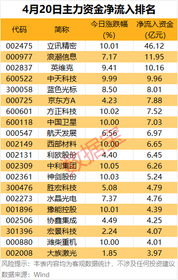 立讯精密主力资金净流入46.12亿元,居首。消息面上,荣耀机器人在2026北京亦庄半程马拉松暨人形机器人半程马拉松比赛中包揽前六名,立讯精密作为荣耀机器人的核心供应商,承接整机代工与精密结构件制造。