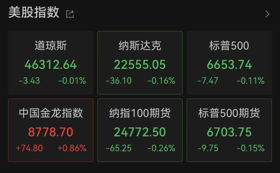 市场方面,美股三大股指小幅低开,截至发稿,道指跌0.01%,纳指跌0.16%,标普500指数跌0.11%,纳斯达克中国金龙指数涨近1%。