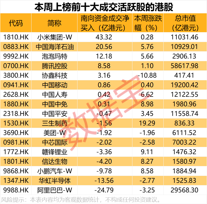 从成交净买入金额来看,大型科技股本周获南向资金买卖不一,小米集团-W本周获南向资金净买入金额最高,达到43.32亿港元,已连续两周居于净买入首位,上周成交净买入43.11亿港元。小米集团-W9月26日以来走势明显下跌,累计跌幅近三成。