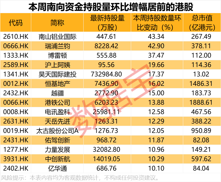 从持股量变化来看,本周15股获得南向资金持股量环比增长超10%,南山铝业国际居首,环比增长43.34%,其他还有瑞浦兰钧、博雷顿、沪上阿姨持股量环比增幅居前,持股量环比增幅分别为42.9%、37.47%、19.66%。